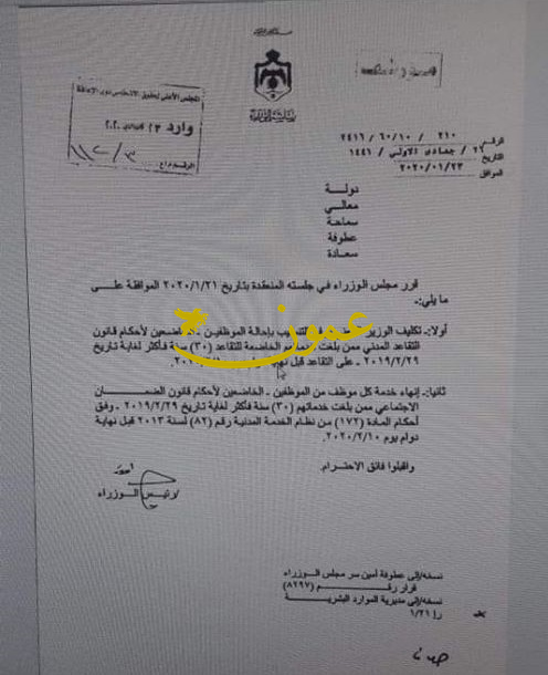إحالة كل من أمضى 30 عاما في الخدمة إلى التقاعد يوم 10 شباط شرق وغرب وكالة عمون الاخبارية